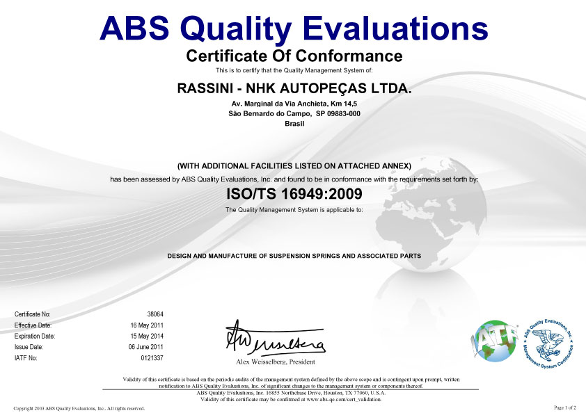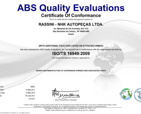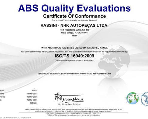 Todas as molas RNA, sejam elas da marca Fabrini ou NHK, são testadas, identificadas e embaladas, seguindo diretamente para as linhas de montagem das principais indústrias automobilísticas no Brasil e no exterior, tendo sua qualidade homologada, aprovada e certificada pelos mais rígidos sistemas de qualidade assegurada, como a ISO/TS 16949:2009.